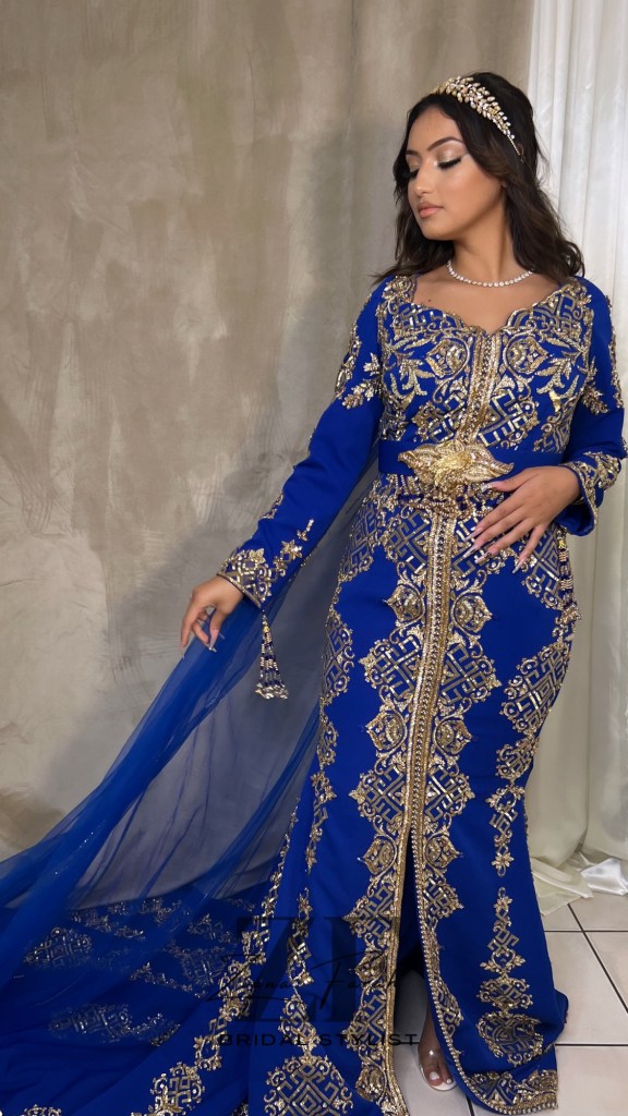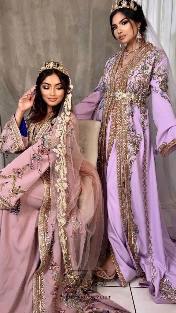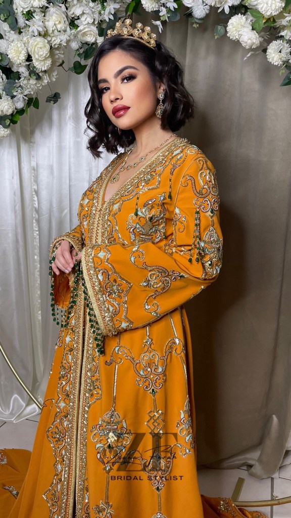 • Caftans marocains : Des modèles somptueux ornés de broderies en sfifa, perles, et paillettes, parfaits pour une mariée ou ses invitées.